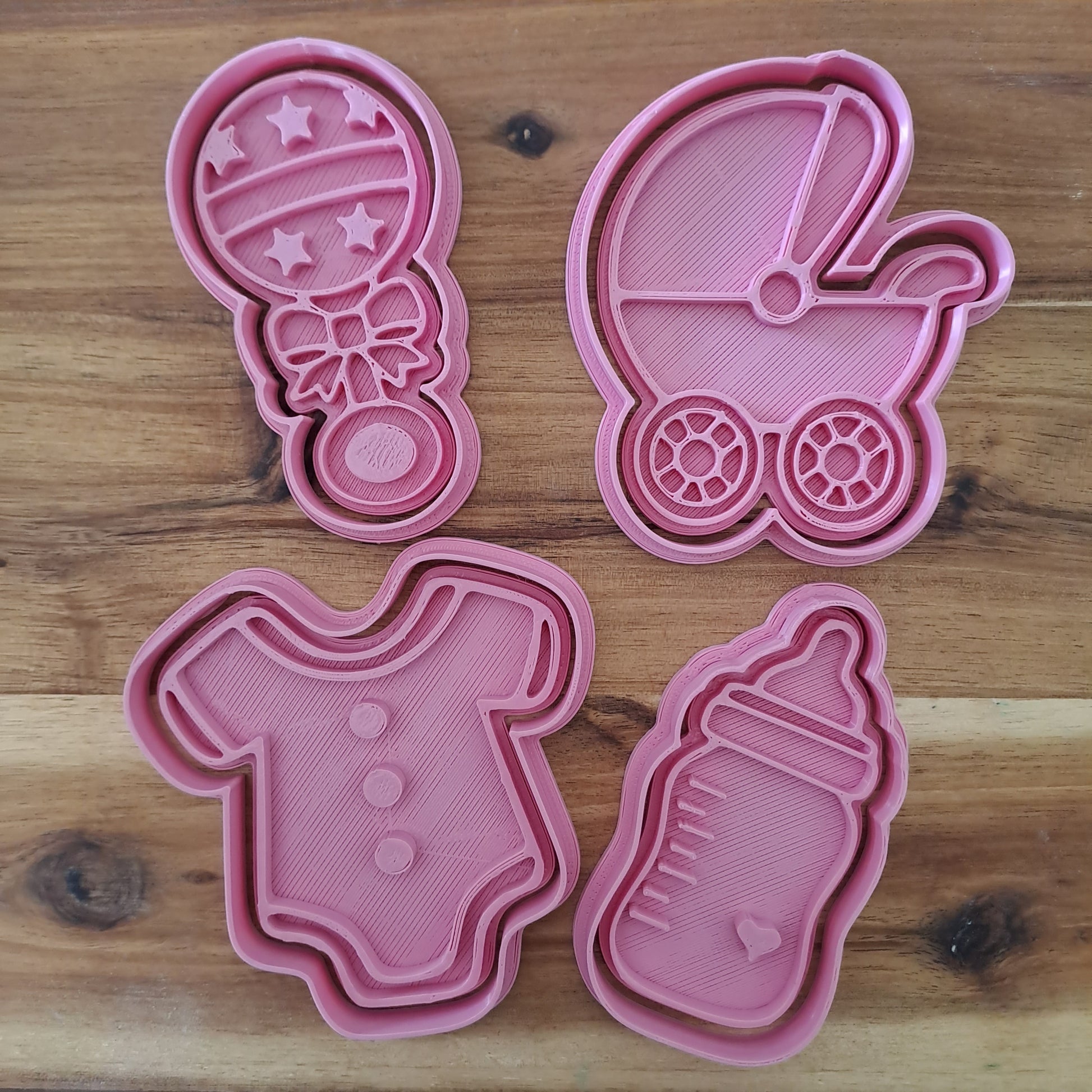 Set Baby Shower composé de quatre emporte-pièces représentant un biberon , un landau , un hochet et un corps , parfait pour créer des desserts personnalisés pour une soirée à thème baby shower.
